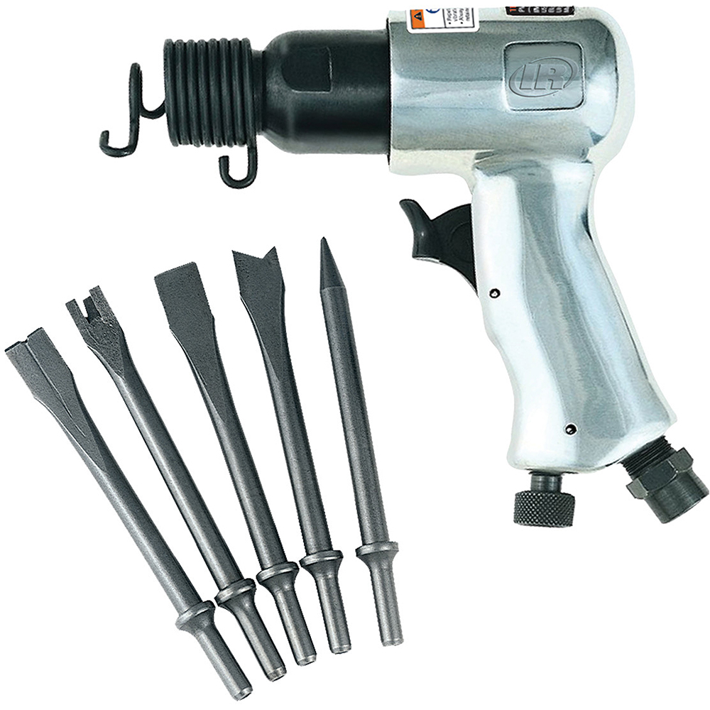 This hammer has an alloyed steel barrel and heat-treated piston to elongate its life and make sure it continues to perform the way it did on day one. Thanks to an ergonomic design, this hammer is lightweight at 2.6lbs and easy to handle. The 115K Ingersoll Rand Standard Air Hammer 5PC Chisel Set, 5000 BPM delivers up to 5,000 blows per minute, but thanks to a built-in power regulator, youll have full control over the speed and power of the tool. Kit includes Air Hammer, and 5 chisels (Punch Chisel, Edging Tool, Tail Pipe Cutter, Blade Straight Chisel, Cutting Chisel).