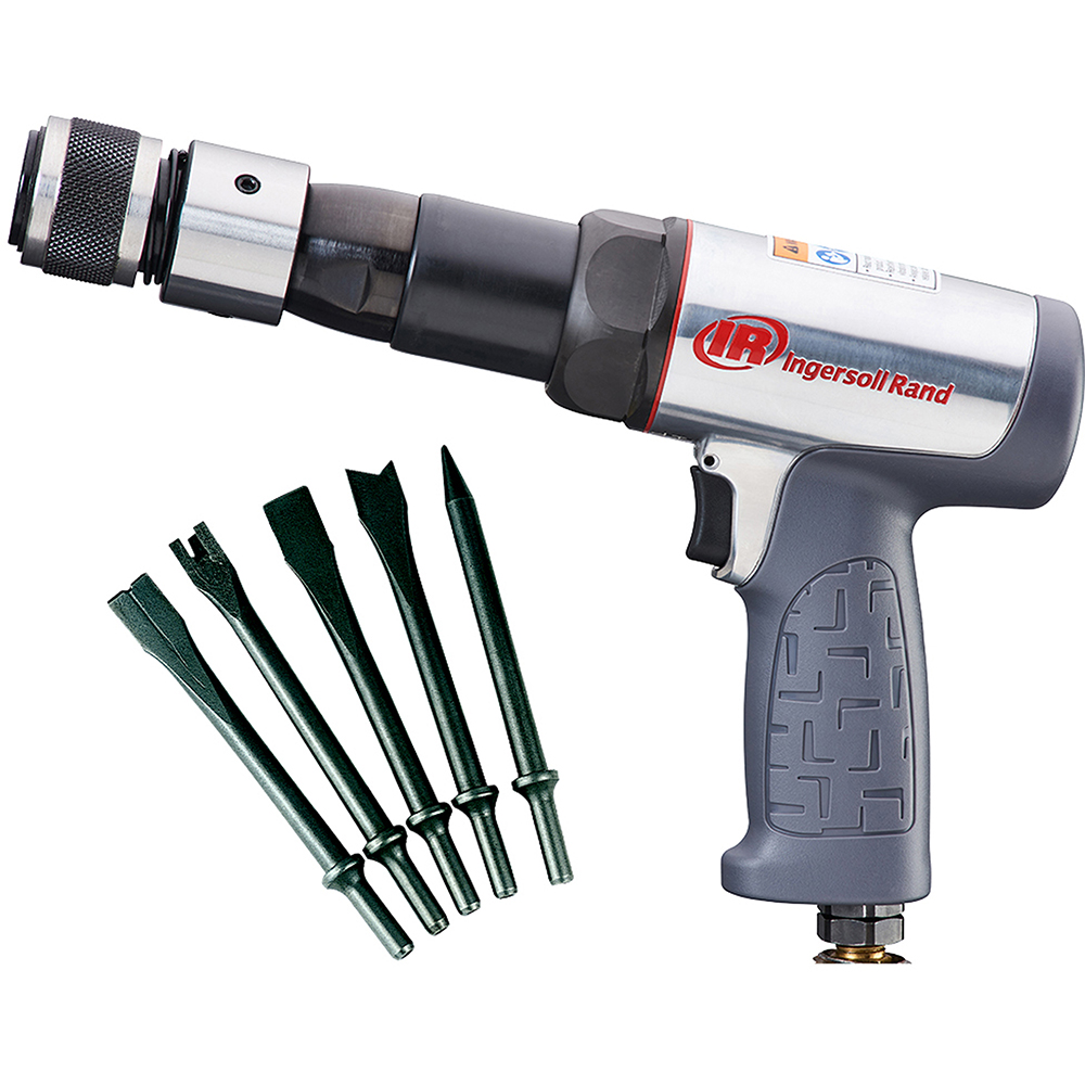 The 119MAXK Ingersoll Rand Vibration Reduced Long Barrel Air Hammer 5PC Chisel Set, 2530 BPM will deliver the punch you need to get the job done quickly and comfortably. Great for exhaust and front-end jobs, general bolt cutting, pin driving, and body shearing work.