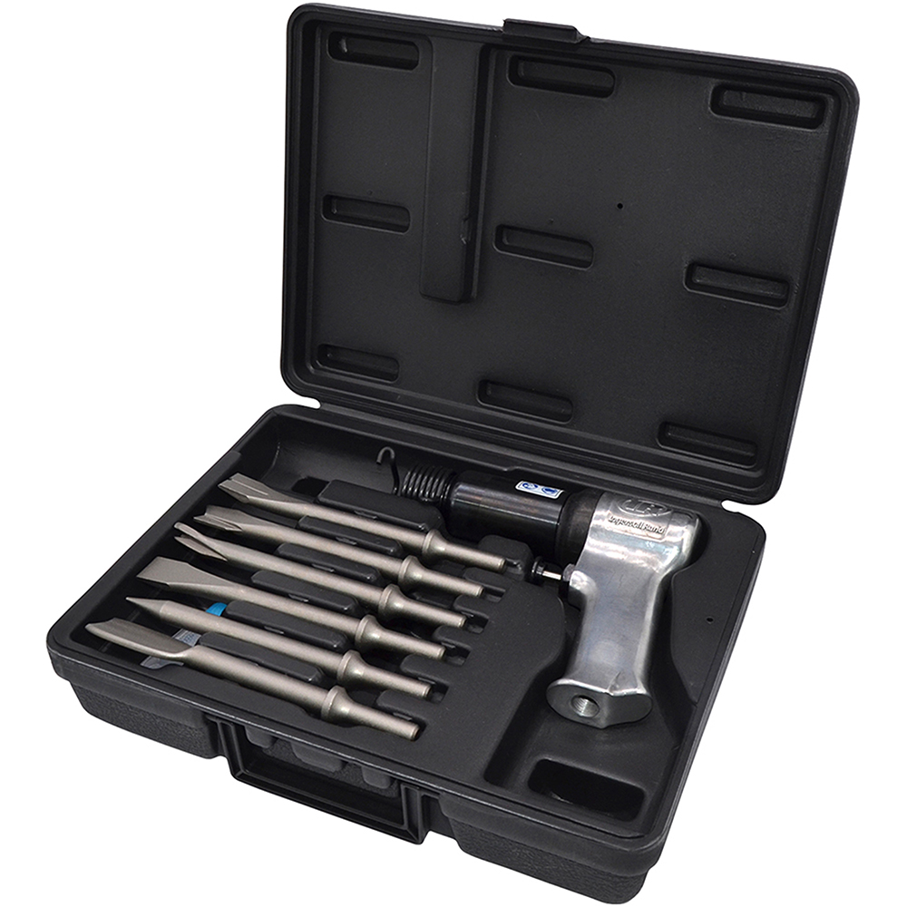 Built to withstand repeated drops and harsh conditions, this hammer will never let you down. The 121 super duty air hammer was built with an alloyed steel barrel and heat-treated piston to make sure it lasts as long as you need it to. This hammer can produce up to 3,000 blows per minute so you can speed through your tasks with ease. This air hammer comes in a blow molded case with 6 chisels. Built-in power regulator and trigger control. ”Easy out” throttle valve assembly.
