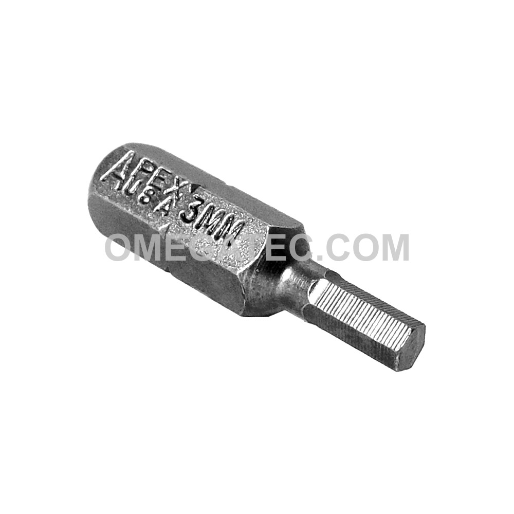 Apex® 1/4” socket head (Hex-Allen) hex insert bits, metric. Hex Size: 3mm Overall Length (in.): 1” Overall Length (mm): 25mm