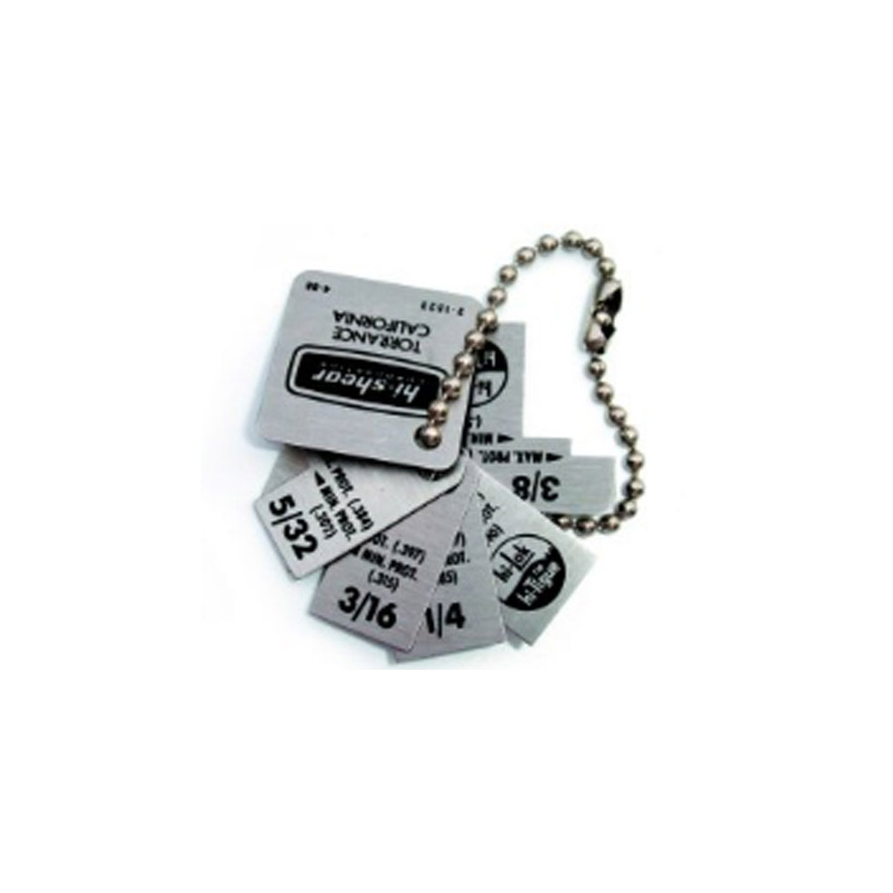 Hi-Shear 2-1522HLM. Set of 6 protrusion gauges for nominal diameter Hi-Lok® and Hi-Tigue® fasteners, sizes: 4mm, 5mm, 6mm, 8mm, 10mm, & 12mm. Individual gages are made with .012 stainless steel and are assembled on a chain.