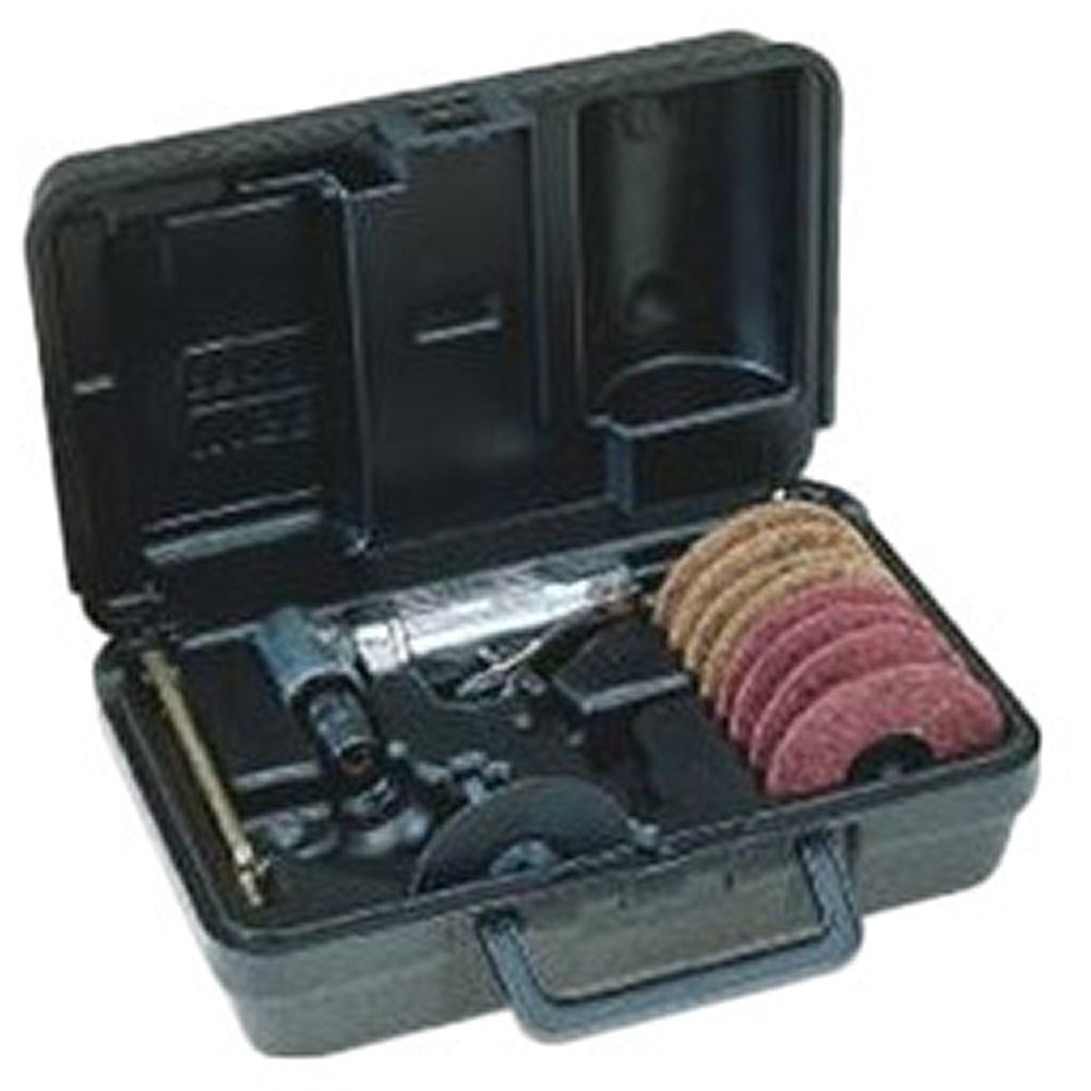 Powerful motor with precision gearing offers 0.25 HP at 21,000RPM. Durable ball-bearing construction offers improved balance, reduces vibration, and ensures a longer product life. Aluminum housing withstands tough operating conditions. Small and sturdy design weighs only 1.02lbs and provides easy operation and the right angle configuration allows better access to tight spots. A front exhaust helps keep work surfaces clean. 1/4” and 6mm collets and a intefral self-locking throttle lever that prevents accidental start-up. Kit Includes: (4) 3” coarse pads, (4) 3” medium pads, and a blow-molded case. The 301B3MK Ingersoll Rand 3” Pad Right Angle Air Die Grinder Kit, 21000RPM provides reliable results across demanding tasks.