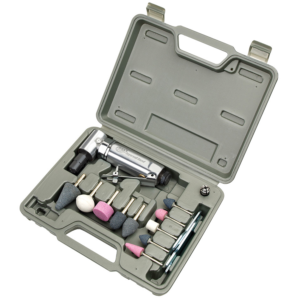 Powerful motor with precision gearing offers 0.25 HP at 21,000RPM. Durable ball-bearing construction offers improved balance, reduces vibration, and ensures a longer product life. Aluminum housing withstands tough operating conditions. Small and sturdy design weighs only 1.02lbs and provides easy operation and the right angle configuration allows better access to tight spots. A front exhaust helps keep work surfaces clean. 1/4” and 6mm collets and a intefral self-locking throttle lever that prevents accidental start-up. Kit Includes: 10 mounted grinding tips and a blow-molded case. The 301BK Ingersoll Rand 1/4” Collet Right Angle Air Die Grinder Stone Kit, 21000RPM provides reliable results across demanding tasks.