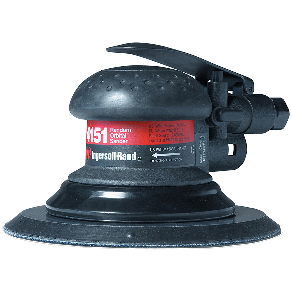4151 Ingersoll Rand 6” Vinyl Pad Random Orbital Sander. Actuation/Throttle Type/Switch Type: Lever Air Inlet: 1/4” NPT Air Pressure (PSI): 90 PSI Arbor/Collet: 5/16”-24 Thread Average Air Consumption (cfm): 8 cfm Average Air Consumption (l/min): 226