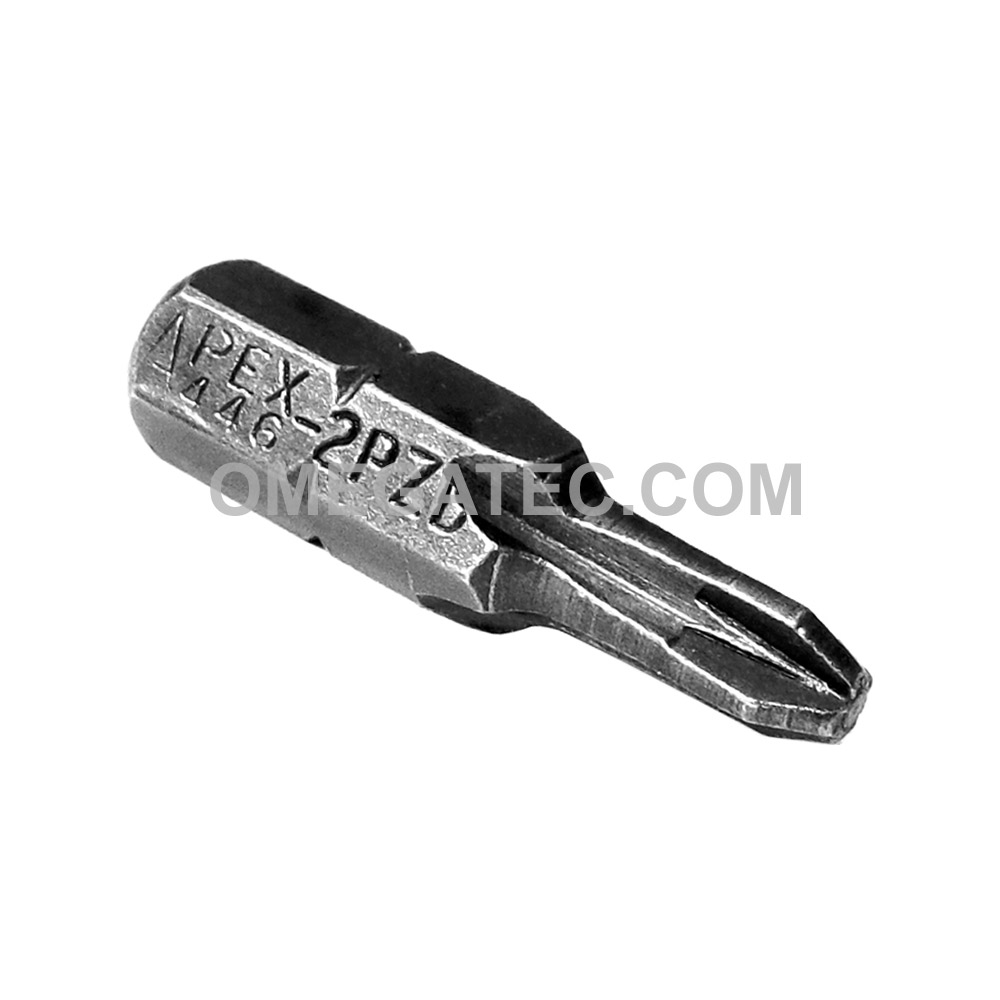Apex Pozidriv ® 1/4” hex insert shank bits – limited clearance. Pozidriv ® fasteners can be identified by the shallow cross indention in the screw head. Pozidriv ® bits from Apex Fastener Tools are constructed with a recess design that provides more contact than a standard Phillips ® which allows for more torque with less possibility of camout.