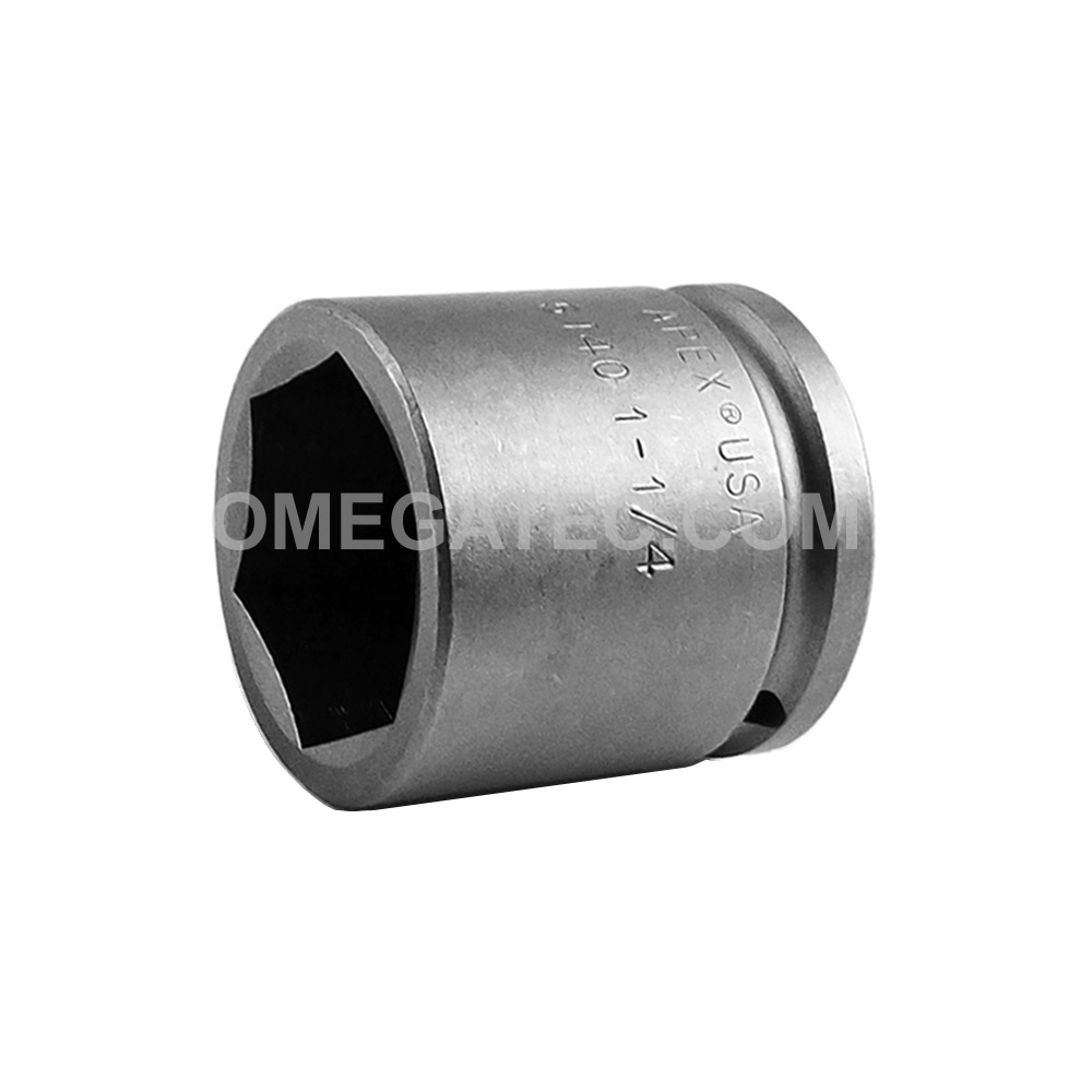 Apex® 1/2” square drive SAE, sockets, standard length, 6 point square drive opening. Hex Opening: 1 1/4” Overall Length: 1 3/4” Diameter Nose End: 1 3/4” Diameter Drive End: 1 3/4” Opening Depth: 13/16”