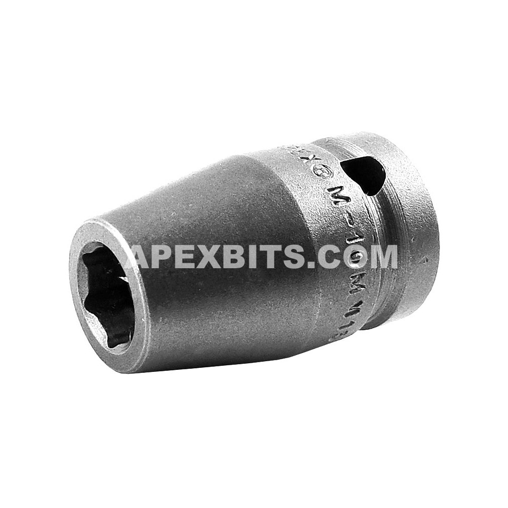 Apex® 1/2” square drive metric sockets, magnetic, standard length, 6 point square drive opening. Hex Opening: 10mm Overall Length: 38.1mm Diameter Nose End: 16.7mm Diameter Drive End: 23.8mm Opening Depth: 6.4mm
