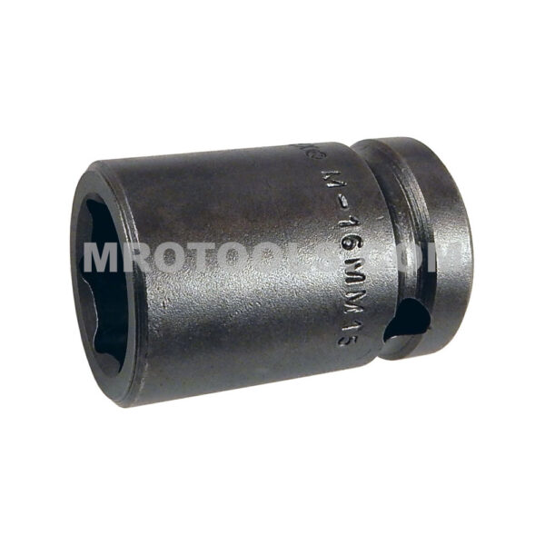 Apex® 1/2” square drive metric sockets, magnetic, standard length, 6 point square drive opening. Hex Opening: 16mm Overall Length: 38.1mm Diameter Nose End: 25.4mm Diameter Drive End: 25.4mm Opening Depth: 11.1mm