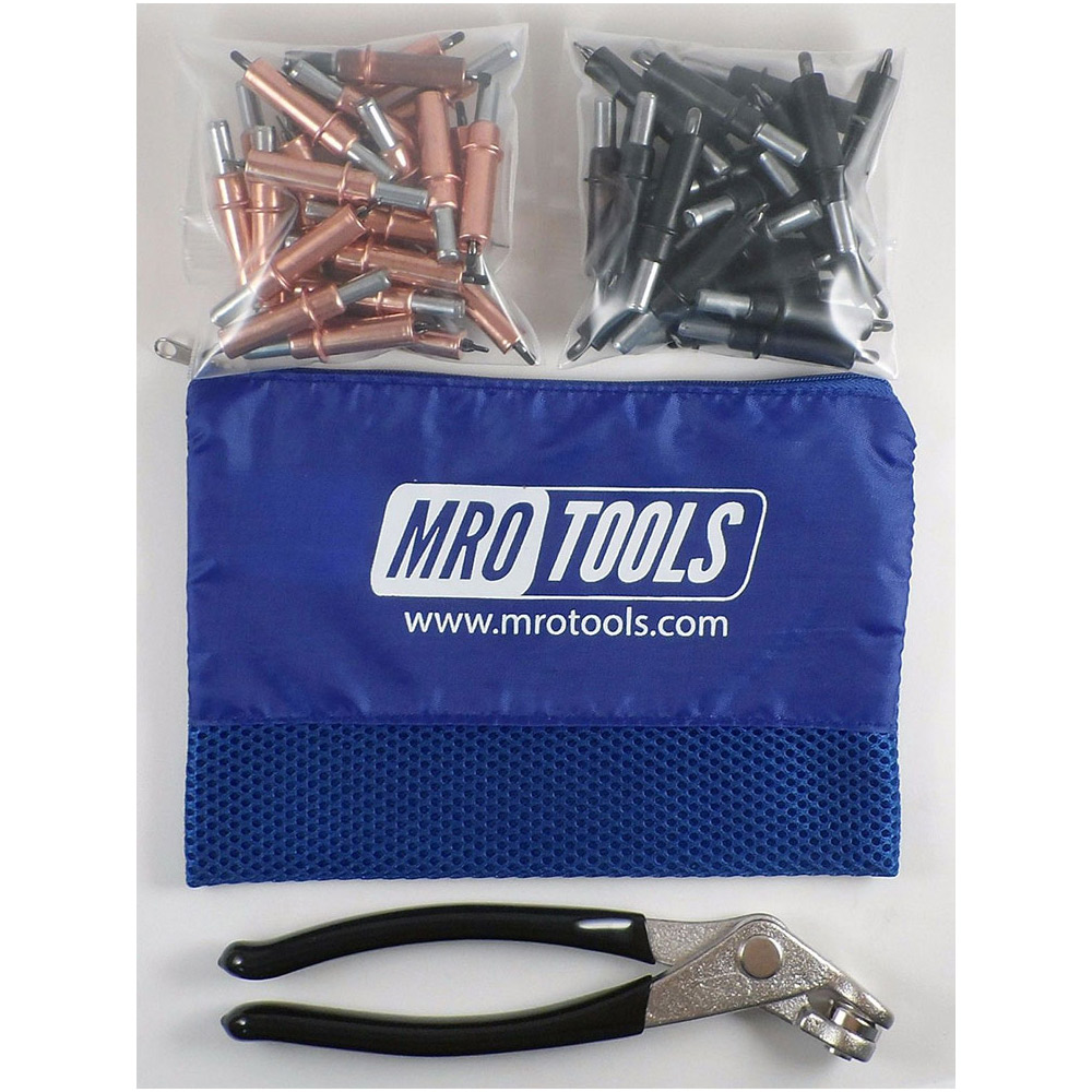 MRO TOOLS Cleco Fastener Sets offers incredible value with its durable, polyester carry bag (6” H x 8.5” W) to hold your Clecos and a pair of Cleco Pliers that are designed for installing spring-loaded fasteners. MRO TOOLS Cleco Fasteners are widely used in automotive, racing, and aircraft sheet metal repair. MRO TOOLS Cleco Fasteners are spring-loaded and steel bodied fasteners that are designed to temporarily fasten multiple sheets of material together before the pieces are permanently joined. MRO TOOLS Cleco Fasteners are a simple and inexpensive alternative to competitive fasteners and are available in various lengths and strengths to accommodate different processes.
