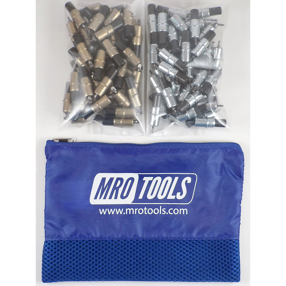 MRO TOOLS Cleco Fastener Sets offers incredible value with its durable, polyester carry bag (6” H x 8.5” W) to hold your Clecos. MRO TOOLS Cleco Fasteners are widely used in automotive, racing, and aircraft sheet metal repair. MRO TOOLS Cleco Fasteners are spring-loaded and steel bodied fasteners that are designed to temporarily fasten multiple sheets of material together before the pieces are permanently joined. MRO TOOLS Cleco Fasteners are a simple and inexpensive alternative to competitive fasteners and are available in various lengths and strengths to accommodate different processes.