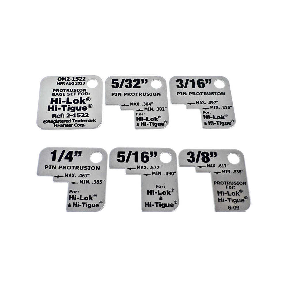 Set of 5 protrusion gauges for nominal diameter Hi-Lok® and Hi-Tigue® fasteners, sizes: 5/32”, 3/16”, 1/4”, 5/16”, and 3/8” Replaces Hi-Shear® 2-1522 Gauge Set.