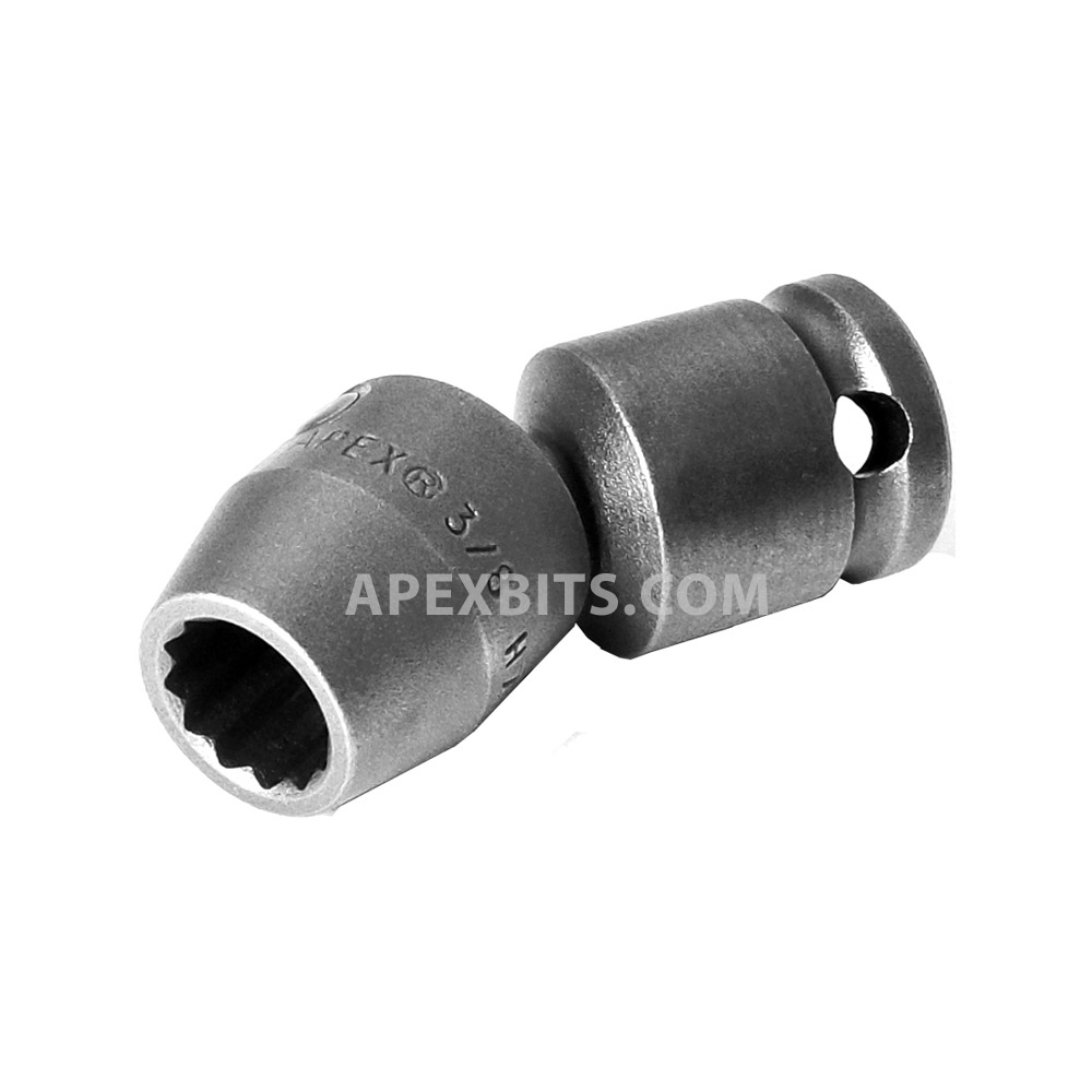 Apex® 3/8” square drive SAE universal wrench, 12 point square drive opening. Hex Opening: 3/8” Overall Length: 1 57/64” Socket Length: 13/16” Socket Diameter: 3/4” Nose End Diameter: 9/16” Clearance Depth: 3/8”