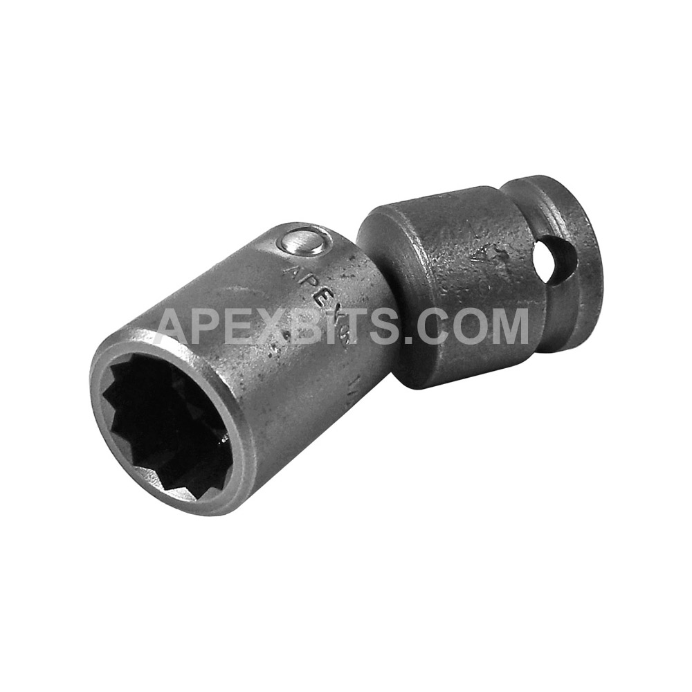 Apex® 3/8” square drive SAE universal wrench, 12 point square drive opening. Hex Opening: 1/2” Overall Length: 2 5/64” Socket Length: 1” Socket Diameter: 3/4” Nose End Diameter: 3/4” Clearance Depth: 9/16”