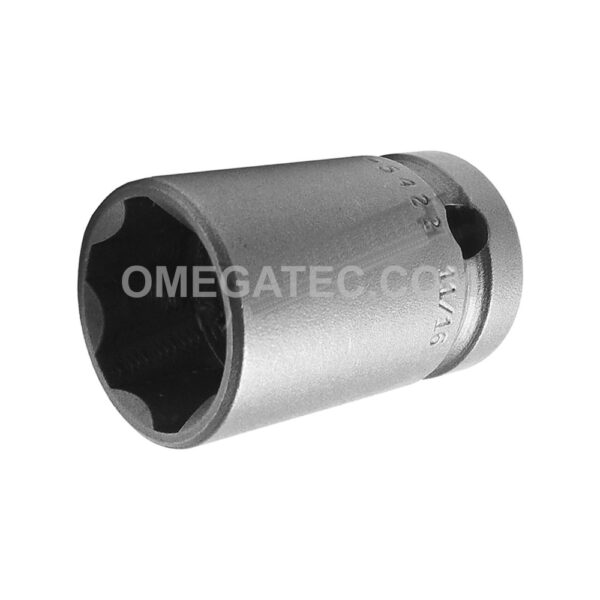 Apex® 1/2” square drive SAE sockets, thin wall, surface drive, standard length, 6 point square drive opening. Hex Opening: 11/16” Overall Length: 1 1/2” Diameter Nose End: 15/16” Diameter Drive End: 15/16” Opening Depth: 7/16”