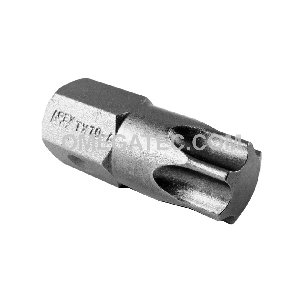 Apex® 5/8” hex insert drive Torx ® screwdriver bits. Hex Flat Type: DP Driver Size: T-70 Major Diameter: 0.610 Overall Length (in./mm): 1 9/16”/ 40mm